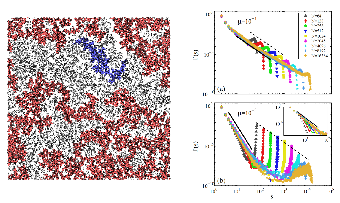 左图为发生刚性逾渗的颗粒堵塞态示意图,红色和蓝色为第一、二大刚性集团。右图为(a)较长和(b)较短吸引力情况下刚性集团大小s的分布,对于较长的吸引,有单一的分布指数,而较短吸引有两个不同的指数,暗示两个不同尺度的存在。