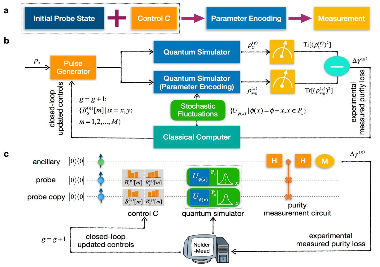 量子度量是量子技术中最具潜力的应用方向之一,相较于经典方式,它可以实现对待测参数测量精度的大幅提升,因而获得了广泛的研究和关注。其一般流程是首先制备一定的探针态,然后与编码动力学进行耦合,最后对末态进行测量以读出参数。然而在实际应用中,探针态的制备面临着诸多挑战。首先,由于量子系统维度随着比特数指数增长,将导致驱动多比特纠缠的探针态非常困难,也使得对候选探针态功效的评估耗费指数增长的资源。其次,如何用给定实验体系中的有限的物理操作去合成最优的探针态也是十分具有挑战性的。最后,控制过程中存在着许多不可避免的扰动,这会使得我们设计出来的控制在具体实施中偏离预期的结果。