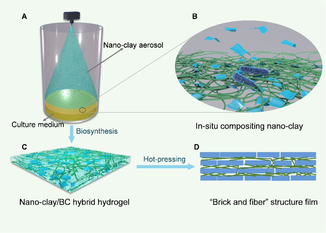 近日,由中国科学技术大学俞书宏院士团队基于微生物发酵过程,成功研制了一类超强、超韧、透明的高性能可持续仿贝壳复合薄膜。该薄膜基于可持续的生物材料,采用一种气溶胶辅助的生物合成法制备。这种新型制备方法完美地结合了纳米材料沉积与微生物发酵过程的优势,成功实现了微生物产物与纳米材料的原位复合,大幅提升了该材料的光学和力学性能。同时,通过纳米粘土片和细菌纤维素两种天然组分,成功构筑了“砖-纤维”仿贝壳层状结构,使该薄膜展现出远超传统塑料的力学性能。得益于这种仿生结构设计和微生物发酵过程中纳米材料原位复合过程,该薄膜集成了多种优异的宏观特性,展现出比塑料薄膜更突出的综合性能,在新型显示、光电转换、柔性电子器件等领域具有竞争力。成果以“Ultra-Strong, Ultra-Tough, Transparent, and Sustainable Nanocomposite Films for Plastic Substitute”为题发表于Matter。