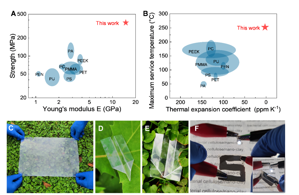 图2. 该薄膜与多种传统塑料强度、模量、最高服役温度和热膨胀系数的Ashby图。(A) 强度和模量Ashby图,表明该薄膜具有优于传统塑料的强度和模量。(B) 最高服役温度和热膨胀系数Ashby图,表明该薄膜具有优于传统塑料的最高服役温度和热膨胀系数。(C) 该薄膜的大尺寸样品。(D-E) 该薄膜可以被折叠成各种形状,且多次折叠后展开无明显损伤。(F) 在展开和弯折的情况下,该薄膜上的电路都可以保持畅通,使LED灯亮。