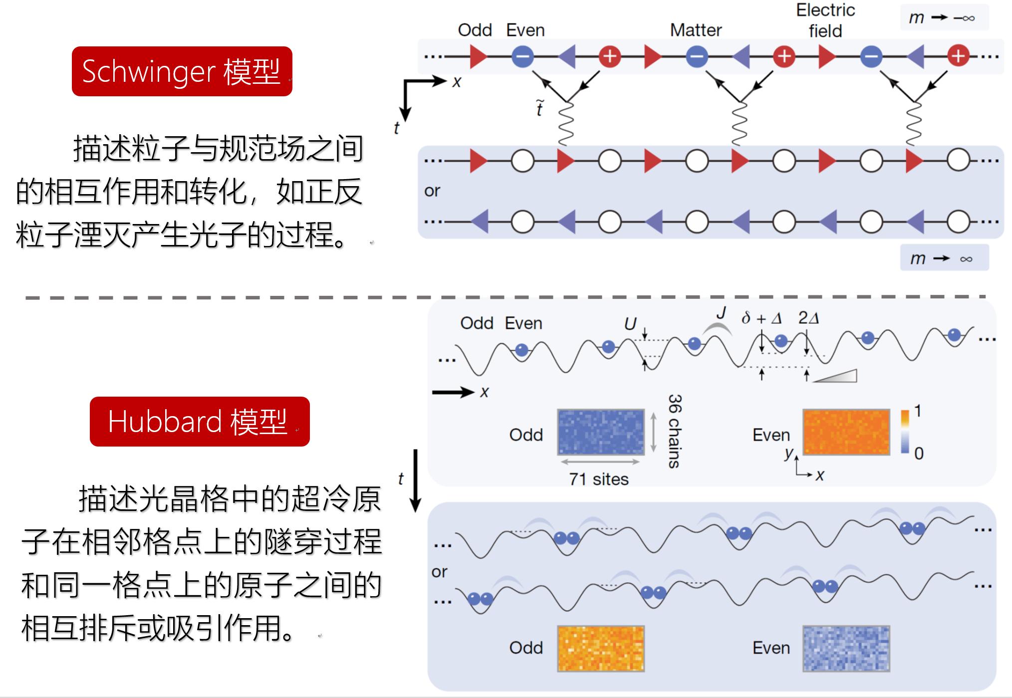 图:一维格点Schwinger模型描述正反粒子通过电场传递相互作用,而正负粒子湮灭后转化成了电场激发。一维Hubbard模型描述光晶格中的冷原子隧穿和相互作用的过程,在特定的势阱形状下,一维Hubbard模型与Schwinger模型的群对称性相同。
