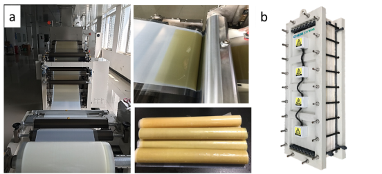 图3. a双极膜中试生产线及膜产品(a); 双极膜电渗析器(b)。