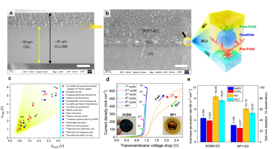 图2.双极膜及中间层断面SEM图(a,b);与商业化产品和文献报道双极膜水解离启动电压及在100 mA cm-2电流密度下水解离工作电压比较图(c);不同电流密度下双极膜运行稳定性(d);双极膜产酸碱效率比较(e)。