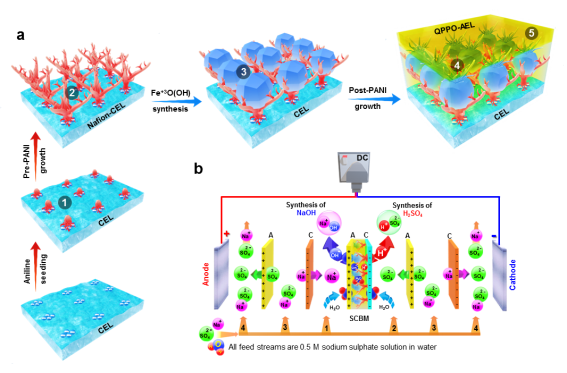 图1.原位生长制备双极膜示意图(a);双极膜电渗析在线产酸碱工作原理图(b)。