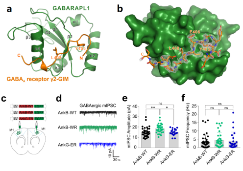 图1:GABARAPL1/γ2-GIM复合物晶体结构以及GABARAP对GABA能神经信号传递的影响