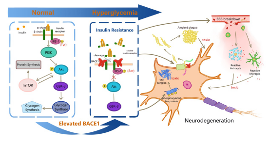 该课题组通过和中国科学技术大学附属第一医院老年科康冬梅、葛余浩和张薇薇主任等合作开展的临床队列研究中发现,传统上认为只有在认知障碍病人血液内增加的BACE1蛋白水平及其切割β-淀粉样前体蛋白的活性,同样也在二型糖尿病人群中增加。该研究组还发现,BACE1蛋白在糖尿病人体内的增加,会过度的切割胰岛素受体(INSR),释放细胞膜胰岛素受体到血液中,影响胰岛素信号传递,因此,BACE1的上调是胰岛素抵抗发生新的风险因素。鉴于胰岛素抵抗本身是认知损伤的重要病理机制,糖尿病患者体内的BACE1可能通过促进 Aβ产生与胰岛素抵抗等多种机制促进认知损伤发生。