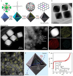 吴宇恩教授利用先前在UiO-66-NH2制备单原子催化剂的基础上(J. Am. Chem. Soc. 2019, 141, 10590-10594),继续使用UiO-66-NH2作为主体,将PdCl2封装入此MOF中。然后通过在PdCl2/UiO-66-NH2表面包覆一层惰性SiO2模板,得到PdCl2/UiO-66-NH2@SiO2核壳结构。然后继续在其表面进行Fe-TiPP聚合,生成PdCl2/UiO-66-NH2@SiO2@Fe-TiPP。最后将得到的PdCl2/UiO-66-NH2@SiO2@Fe-TiPP在700℃氮气条件下直接热解。用NaOH刻蚀去除SiO2模板,得到yolk-shell Pd1@Fe1。从XRD谱图中未发现明显的Pd和Fe晶体峰,说明Pd1@Fe1中无Pd和Fe纳米颗粒。图2b展示了yolk-shell Pd1@Fe1中铁物种的57Fe穆斯堡尔谱,同样表明Fe呈现出原子级分散。此外,XANES谱图表明Fe、Pd的谱线都位于相应的金属箔和金属氧化物之间,表明Fe、Pd均显示带部分正电荷。此外,EXAFS谱图表明,仅在~1.5 ?处出现一个主导配位峰,对应M1-C或M1-N(M=Pd或Fe)键。