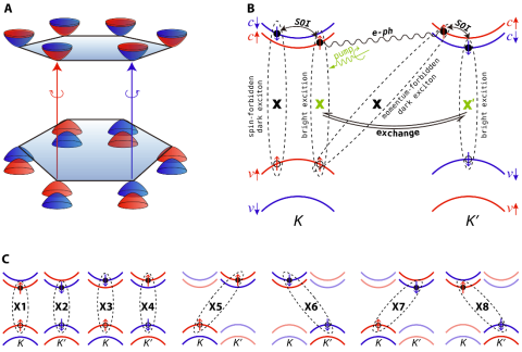GW+rtBSE方法的发展为研究TMD材料的谷激子动力学提供了有力的工具。研究发现在K谷的亮激子被激发之后,大约30飞秒之后会由于电子声子散射形成动量禁止的暗激子;而K’谷的亮激子则在皮秒量级之后出现,这个过程是由电子空穴的交换相互作用导致的,是激子多体效应的直接体现;同时,自旋轨道耦合则能够让亮激子转化为自旋禁止的暗激子,时间尺度也是皮秒量级,整个系统在5ps之后达到平衡,能够形成动量禁止、自旋禁止、以及动量与自旋同时禁止的三种暗激子,平衡之后亮激子与暗激子的占比约为33%与67%。其中多体效应主导了K到K’谷的退极化过程,电子和空穴以激子的形式共同参与,如果使用单粒子激发态动力学方法,这种谷间退极化则几乎无法发生。