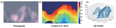 图2:201.5 km成像结果(a)可见光相机图,(b)算法重构结果图,(c)重构结果立体视图。