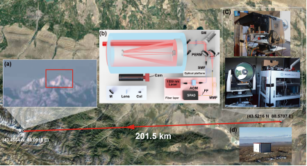 图1:单光子成像实验装置图:(a)201.5 km外目标的可见光相机图,(b)光学系统示意图,(c)实验装置实物,(d)实验场地图。