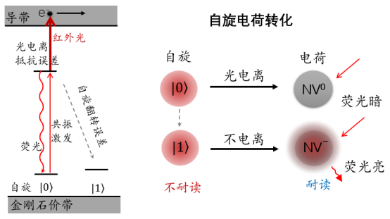 既然自旋态不耐读,能不能把它先替换成皮实、耐读的观测量,再做读出?在本工作里,研究人员从上述思路出发,首先比较了在光读出下电荷态和自旋态的寿命,发现电荷态稳定性比自旋态高5个数量级,在实验中实现了保真度高达99.96%的电荷态非破坏测量。接着,通过引入红外光(1064 nm)诱导的激发态电离通道,将自旋的0和1分别对应地转化成电荷的“电中性”和“带负电”两种状态,进而通过读出电荷态实现对自旋态的读出。实验结果显示,在自旋翻转过程严重的NV色心上,传统共振荧光方法误差为20.1%,而新方法将误差压制到了4.6%。