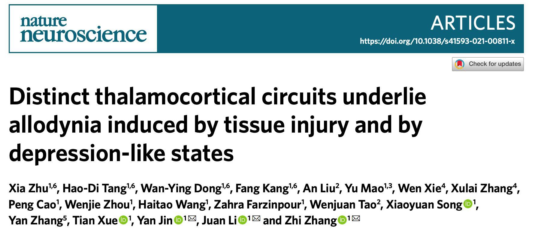 近日,张智课题组与中国科大附属第一医院(安徽省立医院)麻醉科李娟团队联合研究发现,抑郁情绪产生的躯体疼痛与组织损伤产生的疼痛存在不一样的丘脑-皮层神经环路基础,成果以“Distinct thalamocortical circuits underlie allodynia induced by tissue injury and by depression-like states”为题,于北京时间2021年3月9日在线发表于《Nature Neuroscience》杂志。