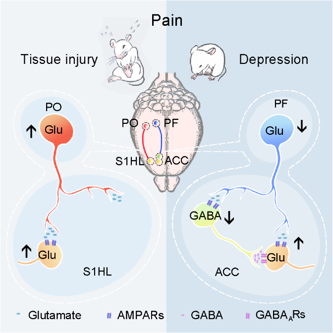 丘脑是痛觉信息传导的中继站,汇聚整合来自脊髓和脑干等核团的疼痛信号,最后通过丘脑-皮层连接对疼痛信息区分和精细加工。该研究以小鼠足底炎症和神经结扎作为组织损伤疼痛模型,综合运用病毒示踪、在体多通道/光纤记录和双光子钙成像等手段研究发现,丘脑后核(PO)投射至初级感觉皮层(S1)的神经环路(POGlu→S1Glu)参与组织损伤产生的痛敏。此外,慢性应激产生抑郁样行为的小鼠也表现出痛敏(作为抑郁症患者躯体疼痛的动物模型)。有意思的是,在该模型动物上,调控POGlu→S1Glu神经环路活性并不能影响痛敏行为,但却发现丘脑束旁核(PF)投射至前扣带回皮层(ACC)神经环路(PFGlu→ACCGABA→Glu)参与抑郁情绪产生的痛敏。本研究不仅为不同病因产生的躯体疼痛(临床治疗方案和治疗效果也不尽相同)发病机理提出了深入的和新的理论见解,也可能为临床上利用rTMS等精准靶向特定神经环路开展物理干预治疗提供新策略。