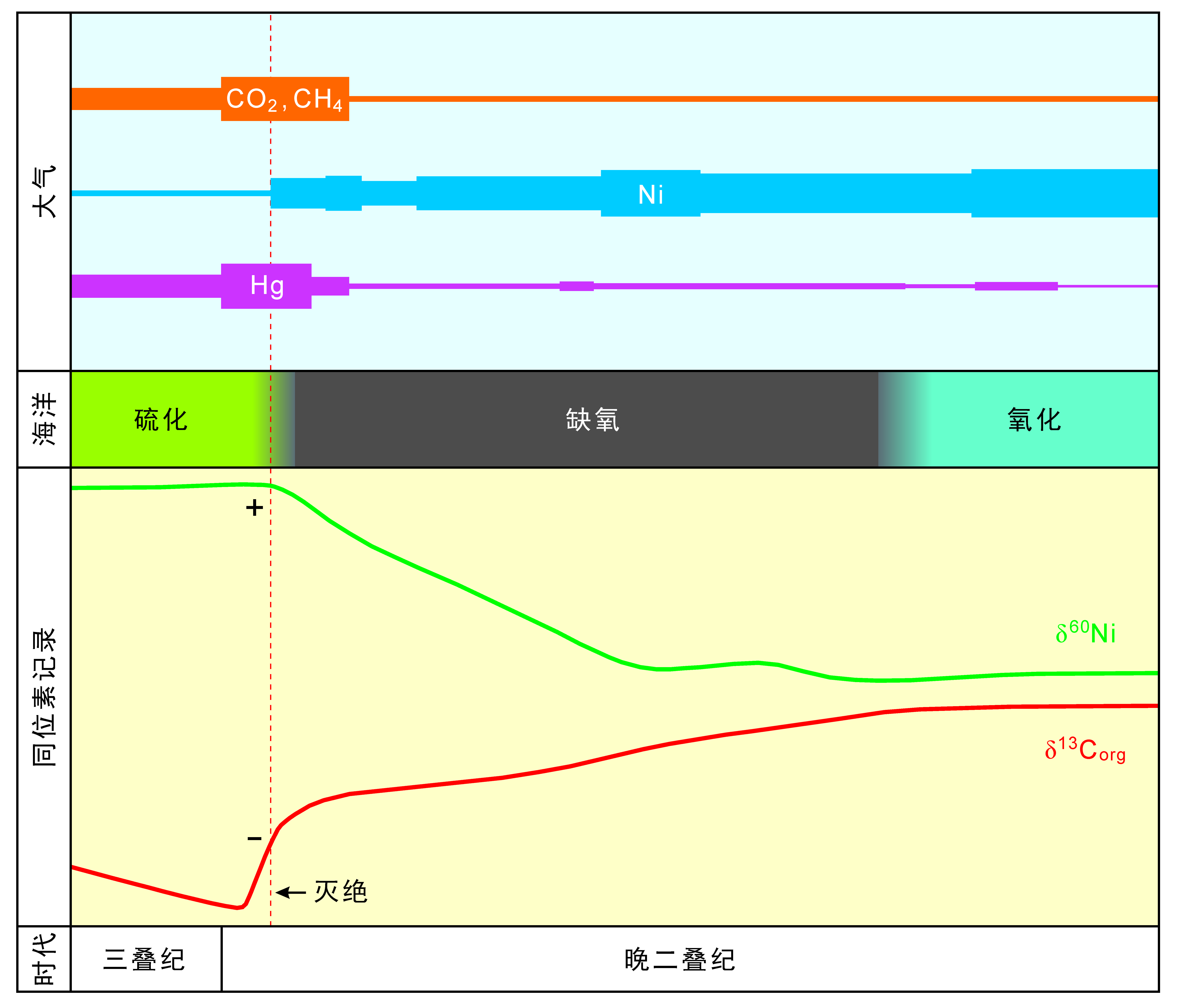 该研究认为,西伯利亚大火成岩省的喷发形成了大量含Ni的气溶胶,它们经过全球大气环流的传输沉降至海洋和陆地。Sverdrup盆地的Ni同位素组成清晰地记录了从火山喷发、大气传输到海洋化学组成变化这一系统过程(下图)。Ni是海洋生物的重要营养元素之一,因此含Ni气溶胶的大量沉降提高了海洋的初级生产力,同时大量消耗了海水中的氧气,其造成的环境恶果是海洋的缺氧和酸化。大量含Ni气溶胶的沉降也造成了陆地生物生长环境的恶化,因为过量的Ni不利于植物的光合和呼吸作用、限制植物的生长及其多样性,最后导致植物的死亡。该研究不仅证明了Ni在改变海洋和陆地环境方面的重要作用,而且为西伯利亚大火成岩省喷发和全球环境变化之间的成因联系搭建了桥梁。
