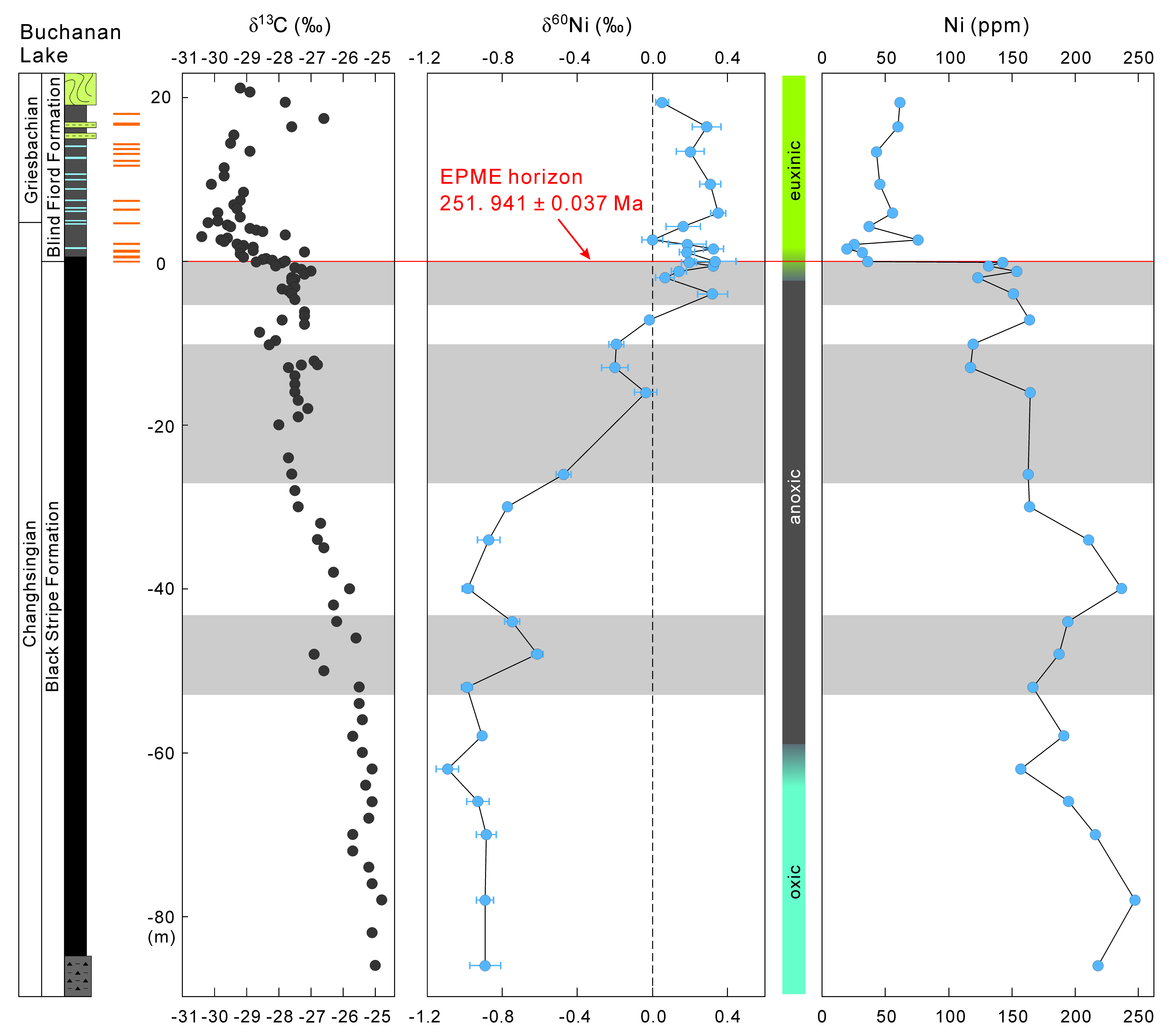 论文的第一作者博士后李梦涵介绍说:“我们的研究对象是分布在加拿大北极地区Sverdrup盆地的Buchanan Lake剖面。从古地理位置来看,Sverdrup盆地距离西伯利亚大火成岩省大约2万公里,且处于其下风口,火山喷发的产物大约只需要4-8天就可以到达该盆地,因此它是研究二叠纪末火山喷发如何驱动环境变化的理想地区”。研究人员对Buchanan Lake剖面进行高精度Ni同位素测试后发现,Ni同位素的组成与当时海水中的氧气含量以及化学组成具有良好的相关关系(如图)。在二叠纪末生命大灭绝层位,Ni的含量由142.8 ppm突然降至36.4 ppm(如图)。另外,Buchanan Lake剖面的Ni同位素组成非常轻,是35亿年以来沉积岩中最轻的Ni同位素组成。