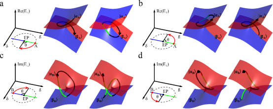 图:奇异点的能谱结构以及动力学环绕奇异点导致的本征态转换。蓝色和红色曲面分别对应非厄米哈密顿量的两个本征能量,两者在相交的奇异点附近呈现出独特的拓扑结构。能谱面上带箭头的曲线对应环绕奇异点的演化轨迹。图a和图b的环绕起点处在宇称时间对称相,呈现出非对称的本征态转换,即末态取决于环绕奇异点的方向,图c和图d的环绕起点处在宇称时间对称破缺相,呈现出对称的本征态转换,即末态不依赖于环绕奇异点的方向。