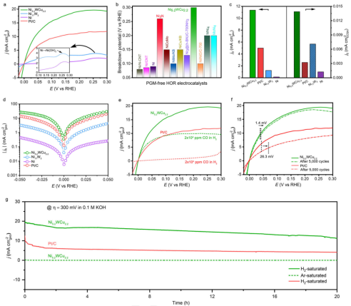 图3.Ni5.2WCu2.2合金的电催化HOR活性以及稳定性测试。