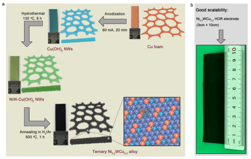 图2.a Ni5.2WCu2.2合金的合成方法示意图。b 宏量制备得到3×10cm2的Ni5.2WCu2.2电极。