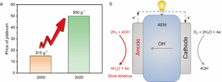 图1. a铂金在过去二十年里的价格变化趋势。b 阴离子交换膜燃料电池示意图。