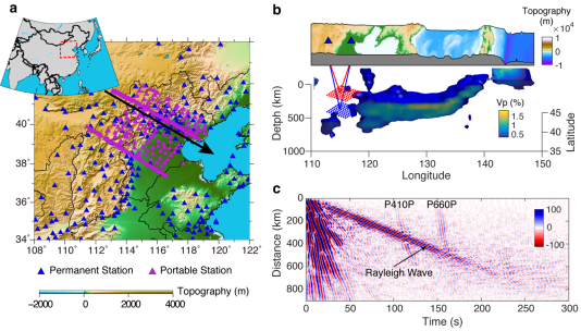 地幔转换带是上地幔和下地幔过渡区域,以410-km和660-km间断面为界,地幔转换带的结构和性质对地幔对流过程有着至关重要的影响。由于玄武岩洋壳在地幔转换带底部的密度小于周围正常地幔,因此在660-km间断面附近玄武岩洋壳具有负浮力,可以在重力的作用下滞留在660-km间断面附近。但是玄武岩洋壳具有负浮力的深度范围比较窄,并且俯冲大洋板片具有更低的温度和粘滞度,因此俯冲的洋壳能否与大洋岩石圈地幔分离并滞留在地幔转换带底部仍然存在很大的争议。过去研究地幔转换带结构主要是利用天然地震体波震相的走时和幅度信息来约束地幔间断面的深度和速度跳变,因此传统地震学方法的使用往往受制于天然地震的时空分布。