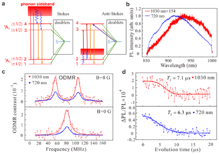 实验结果图。图a-d分别比较了反斯托克斯(1030 nm激发)和斯托克斯(720 nm激发)的激发过程、光谱、ODMR谱和自旋回波探测。