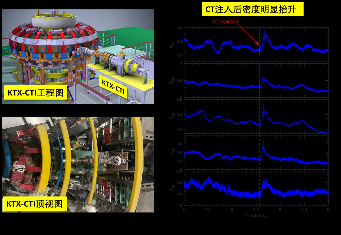 在本轮实验中,由多途径磁约束核聚变研究团队研制的紧凑环注入系统(KTX-CTI)被安装至科大反场箍缩磁约束聚变实验装置(Keda Torus eXperiment, KTX)上开展等离子体注入研究,紧凑环等离子体以正入射方式注入。KTX-CTI紧凑环注入系统总长3米,由两套20千伏高压脉冲电源进行双电源驱动,电源短路最大电流达550千安;装置同时配备自主研发的高密度高带宽光纤激光干涉仪进行实时等离子体电子密度和注入速度诊断。在KTX反场箍缩等离子体放电过程中,紧凑环高速注入后多道太赫兹干涉仪观测到等离子体密度剖面显著抬升,表明注入紧凑环等离子体已经穿透强磁场实现与主等离子体的融合达到加料效果。实验目前已经实现了最高注入速度285千米每秒、等离子体最大密度1.2×1022每立方米和最大粒子数达7.1×1019,指标跻身国际前列。