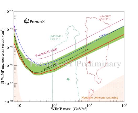 为了提升暗物质探测灵敏度,2019年起PandaX团队在锦屏二期(国家发改委“十三五”重大科学基础设施项目之一)的B2实验厅建设起了新一代的4吨级暗物质探测实验:PandaX-4T;同时国际上在建的多吨级液氙实验还有欧美合作的XENONnT实验以及美国的LZ实验。为了加快实验进度,PandaX团队提前搭建了临时配套设施和900吨的超纯水屏蔽系统。2019年8月实验组进驻;2020年5月底克服疫情影响完成探测器安装;2020年11月28日,探测器调试完成进入试运行;2021年4月15日试运行结束,共取得稳定数据95天。在此次95天数据中,PandaX-4T探测器共记录了13.7亿次事例,其中仅仅1058个低能区事例通过了数据质量筛选进入最终暗物质分析数据集,本底比PandaX-II降低了4倍左右;其中有6个事例落在了暗物质信号最可几的参数空间区域。结合模型分析了各种本底成分,我们认为这6个事例在统计上与我们的本底模型一致,我们的数据未发现统计显著的暗物质超出信号。由于PandaX-4T出众的灵敏度,此次结果涵盖了之前未被其他实验探索国的暗物质与普通物质反应截面参数空间,取得了目前对高质量暗物质最好的限制。