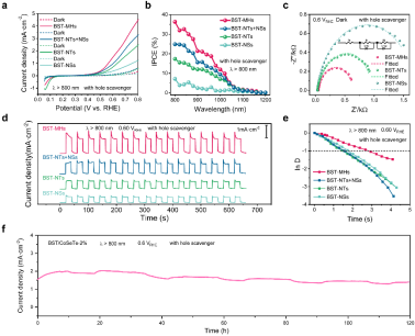 研究人员设计了一种具有晶格匹配的形貌异质结的BiSeTe三元合金基光阳极(图1),该电极的光谱吸收范围扩展到了1100 nm,其光电化学制氢的能量转换效率得以改善。晶格匹配的形貌异质结由于避免了晶格失配的影响而降低了界面缺陷的存在,有利于降低光生载流子的复合速率,这为提高光电极的能量转换效率提供了方向。实验证明,异质结的存在提高了光生载流子的分离效率,进而延长了载流子的寿命。因此,在近红外光下,BST-MHs光阳极的IPCE(在800 nm下为36%)和光电流密度(在0.75 VRHE下为3.7 mA cm-2)均展现出了优异的性能(图2)。