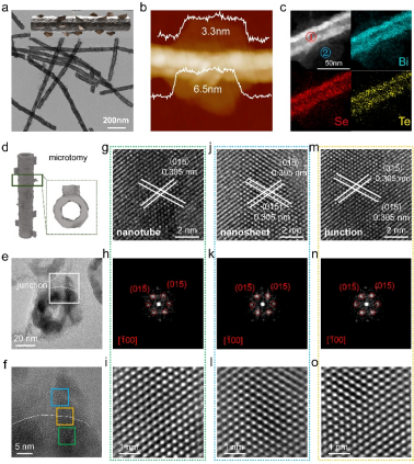 图1. BST-MHs的形貌与组分表征。(a)BST-MHs的TEM图像。(b)BST-MHs的AFM图像。(c)BST-MHs的暗场STEM图像和EDS元素面分布图像,选取的为Bi-M(蓝色),Se-K(红色)和Te-L(黄色)信号。(d)BST-MHs的切片示意图。(e, f)界面处的TEM图像和HRTEM图像。(g, h, i)图c中绿框内纳米管的HRTEM图像、FFT图像和反转FFT图像。(j, k, l)图c中蓝框内纳米片的HRTEM图像、FFT图像和反转FFT图像。(m, n, o)图c中黄框内界面的HRTEM图像、FFT图像和反转FFT图像。