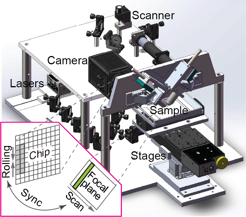 目前的脑图谱研究主要集中于小鼠,国际通用的成像技术对其进行微米分辨率全脑成像通常需要数天的时间,而猕猴脑体积为鼠脑的200倍以上,要在较短时间内完成全脑成像是一项极大的挑战。为应对这一挑战,团队此前在中科院“脑功能联接图谱”战略性先导专项和科研仪器研制项目、以及国家自然科学基金“情感与记忆的神经环路基础”重大研究计划项目的支持下,经过数年的攻关,研发了VISoR高速三维荧光成像技术(工作于2019年发表于《国家科学评论》)。这一技术通过斜截面扫描照明与同步成像实现了在样品连续运动时进行无模糊的图像采集,消除了传统大样品成像需要在不同的小视野切换、停顿所带来的时间损失,数据采集速度比当前通用于小鼠脑图谱绘制的几种三维光学成像技术提升数十倍,使得猴脑图谱解析成为可能。