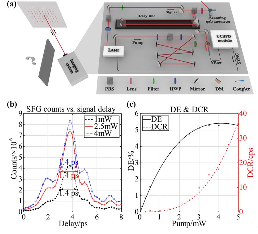 图1. (a).高精度非视域成像装置,(b).脉冲泵浦上转换单光子探测器时间分辨力实验结果,(c).脉冲泵浦上转换单光子探测器探测效率及暗计数实验结果。
