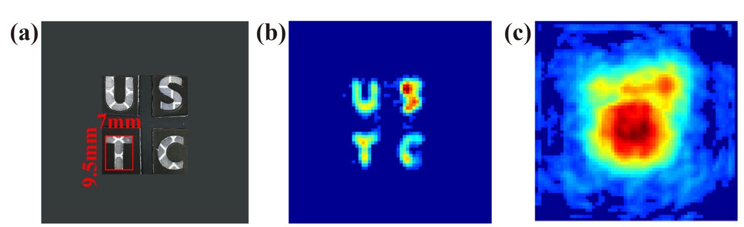 图2. (a).成像目标文字,(b).本工作非视域成像结果, (c).传统非视域成像结果。