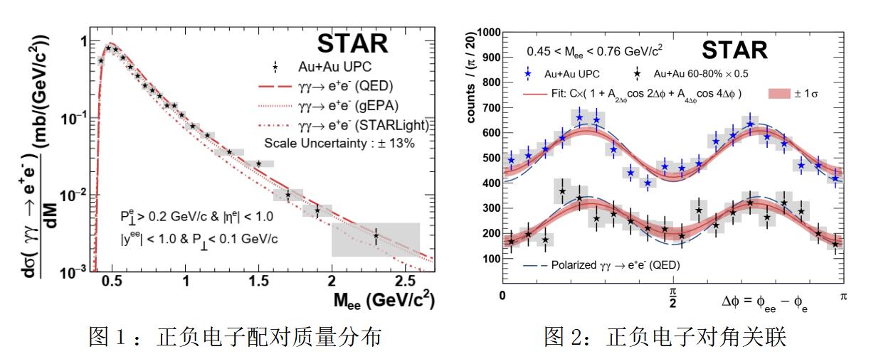 我校近代物理系首任系主任赵忠尧先生是人类物理学史上第一个发现反物质的物理学家,并观测到正负电子对的湮灭现象:e+ + e- →γ + γ。1934年,科学家布雷特和惠勒提出这个现象的反过程,让两个光子通过撞击结合在一起,有可能变成物质,形成电子和正电子。这种把光变成物质的过程是爱因斯坦质能方程E=mc2的直接反映,表明能量和质量是可以相互转化的。长期以来,人们期望通过超强功率的激光碰撞来观测这个过程,然而两个光子发生碰撞的概率非常低,其所需的最低激光功率仍然比目前功率最高的激光系统要高几个数量级。在布雷特和惠勒提出这个反应过程时,激光并没有被发明,他们提出可以通过加速重离子到相对论能区并碰撞来实现光生物质。RHIC-STAR的研究团队利用相对论重离子碰撞来寻找布雷特-惠勒的产生过程,在海量数据中找到6000多正负电子对,通过分析这些候选事例的配对质量和角分布以及与理论计算的比较,证实这些正负电子对源自布雷特-惠勒过程。更进一步,该研究团队观测到正负电子对的角关联呈现4阶余弦振荡,这是真空双折射现象的有力证据。