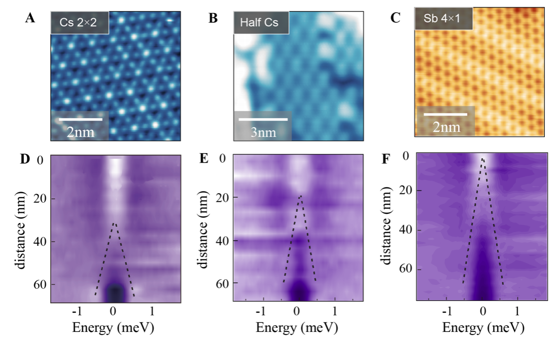 A –C: CsV3Sb5不同表面的原子分辨形貌图。D-F:不同表面情况下磁通态随空间的演化规律。在Cs表面上,30nm空间尺度的零能电导峰对应着马约拉纳束缚态的出现。随着表面的演化,该特征逐渐消失。