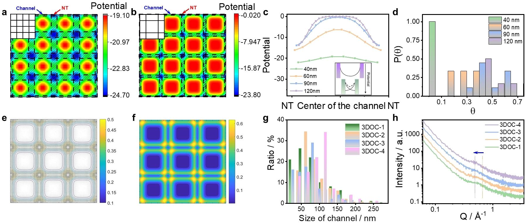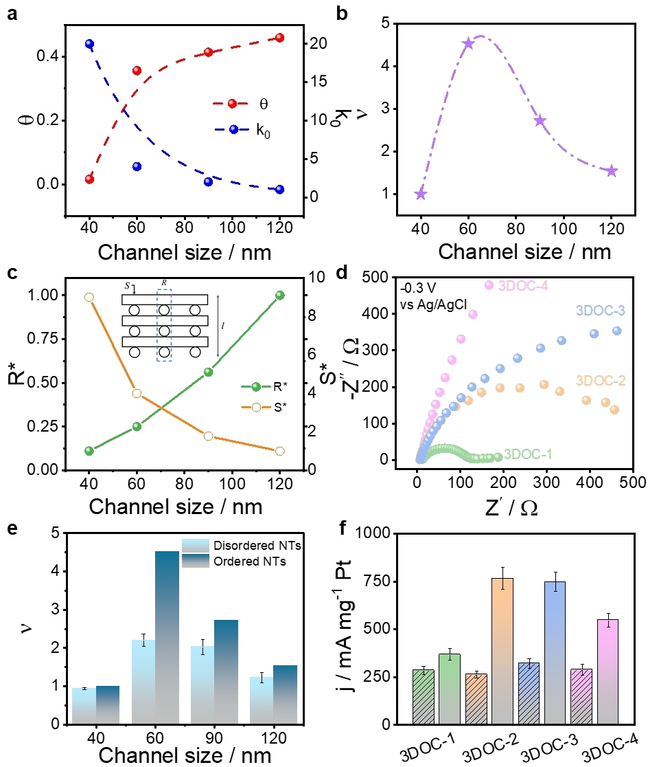 研究人员选取铂纳米管(Pt NTs)为模型催化剂,利用气液界面组装和原位电化学刻蚀活化策略构筑了理想的最大程度暴露活性面的三维有序通道结构(3DOC),并选取甲醇氧化反应(MOR)作为模型反应对其电催化性能进行了测试。通过调节三维通道的尺寸大小,研究人员发现存在最佳的尺寸使得甲醇氧化性能最高,比传统滴涂形成的杂乱分布的催化剂性能提升近2倍。研究人员从电极表面的自由能密度函数出发,建立了一个全动力学模型,对不同孔径通道内甲醇分子的电势分布、传输速率、浓度分布以及三维通道的上下电子输运进行了模拟。结果表明,三维通道尺寸增大将极大地避免催化剂表面双电层的交叠,从而促进甲醇分子从体相电解质到催化剂表面双电层的传质过程(图2)。