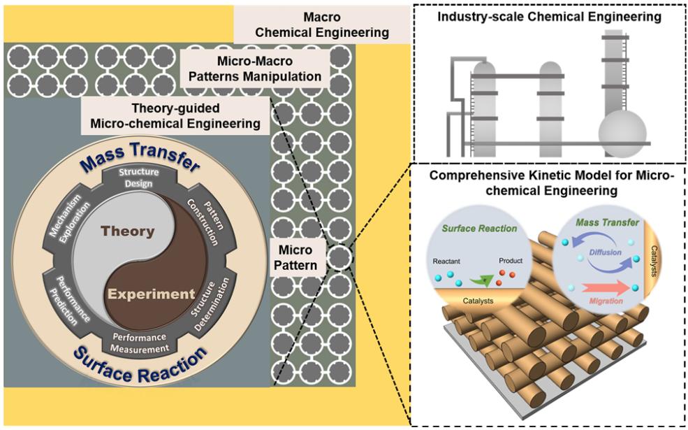 化学工程,于19世纪末开始发展并逐渐影响到工业生活的方方面面,是基于非线性耦合化学反应的动量、能量和质量传递的研究,强调的是诸如搅拌、分离、纯化等单元操作的工艺优化。与工业规模的化学工程一样,传质过程和表面反应也是纳米尺度上非均相电催化反应的重要组成部分。目前,工业化工的研究已经相当成熟,但是对微纳米尺度的化工研究还罕见报道。