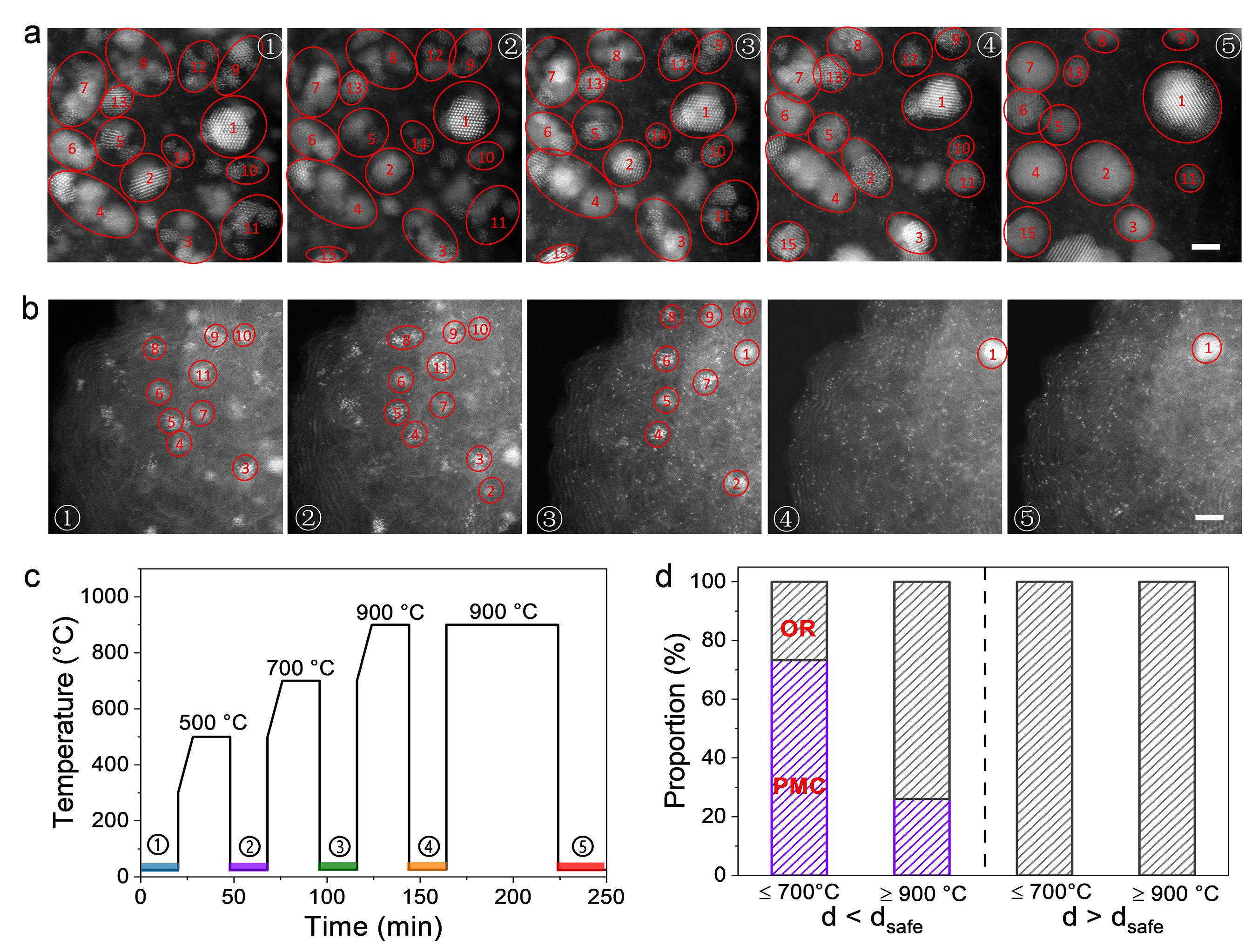 原位高温球差电镜研究发现,存在临界颗粒距离的原因是颗粒距离依赖的烧结机制现象:在颗粒间距较小的催化剂中,颗粒相距较近,主要通过PMC机制发生烧结,并且聚集引起的粒径分布宽化会增加不同颗粒尺寸和表面能的差异,从而加剧颗粒Ostwald熟化;而在颗粒间距较大的催化剂中,颗粒相距较远,PMC机制被很大程度上抑制,同时Ostwald熟化也会减缓(图3)。