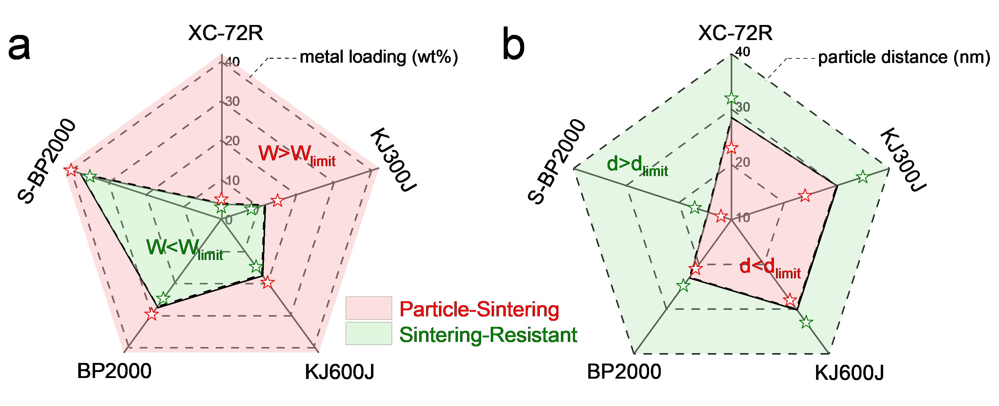 在该项工作中,研究人员首先使用具有不同比表面积的碳载体,通过调控金属载量构建出不同颗粒间距的催化剂体系,并考察他们在高温900°C下的烧结情况(图1)。高角环形暗场透射电镜和X射线衍射表征发现存在明显的抑制金属烧结的临界担载量和临界颗粒距离。基于此,研究人员定量化出抑制催化剂烧结的临界颗粒距离(图2)。