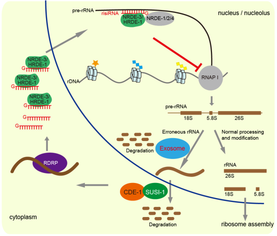 siRNA是一类长度约为22个核苷酸长的非编码小RNA,广泛存在动植物中,在机体的生长发育、生殖遗传和免疫防御等方面行使重要功能,也是优秀的药物分子。光寿红课题组多年来以秀丽隐杆线虫为研究对象,通过正向和反向遗传学筛选,鉴定了一系列抑制内源siRNA产生的SUSI因子,该类因子广泛参与了细胞中核糖体RNA加工和降解的过程。当SUSI因子功能缺陷时,细胞内会积累错误加工的核糖体RNA片段,这些片段与RNA依赖的RNA聚合酶相互作用后,会进一步诱导risiRNA的生成。risiRNAs与核糖体RNA序列互补配对,通过激活细胞核RNA干扰通路,进而调控核糖体RNA水平。