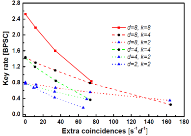 图2:实验结果图。横坐标为环境噪声的强度。纵坐标为每对光子能产生的密钥比特数。其中d为纠缠态的维度数,k为子空间的维度数。最下边的一条线对应两维比特系统。