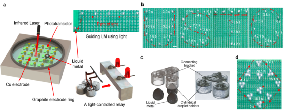 近日,联合研究组还提出了一种通用的光诱导液态金属液滴驱动方案:使用激光束选择性地激活电解液中的光电晶体管,从而利用马拉格尼力(Marangoni force)实现对液态金属液滴的电驱控制(图3)。该方案无需复杂和庞大的系统,简单利用光即可诱导多个液态金属液滴的并发运动、分裂和合并,研究人员也展示了其在光控继电器等方面的应用。这种用于操纵LM液滴的光诱导控制方法为在MEMS、现场可编程机器人和基于液滴的液体协作机器人领域的未来创新研究提供了新的方向和技术途径。相关成果以标题为“Light-controlled versatile manipulation of liquid metal droplets: a gateway to future liquid robots” 发表在Materials Horizons上,并被选为封底文章。