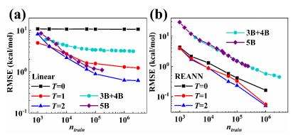 图2:递归嵌入原子神经网络与包含5体以及3体+4体的机器学习模型构建CH4分子势函数的精度比较,图 (a)和图 (b)分别是线性拟合和非线性拟合的结果。