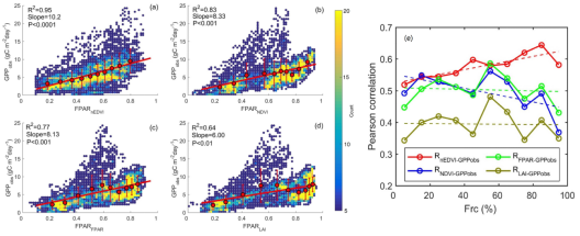 图1:站点实测GPP与(a)基于微波EDVI,(b)基于MODIS光学的NDVI,FPAR和LAI植被指数的FPAR相关性对比。(e)站点实测GPP与微波和光学植被指数在不同云盖条件下的相关性。