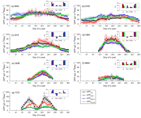 图2:地基实测GPP(黑色)、该研究卫星遥感的EDVI-GPP(红色),另外两种卫星遥感MOD17-GPP(蓝色)和ECLUE-GPP(绿色)在7个不同植被类型站点的比较