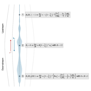 本研究根据粒子模拟中波动增长率的分析,电子的相空间动力学以及非线性波粒相互作用理论,提出了一个名为“Trap-Release-Amplify” (TaRA) 的理论模型(图二)。当应用于地球磁层时,该模型依据波动传播方向,将空间中赤道附近区域(波动源区)分成上下游。这两个区域在波动激发中扮演相对不同的角色。在下游区,非线性波粒相互作用形成了相干的电子相空间结构;而在上游区域的释放点,当粒子与波动满足相位锁定条件时,波和粒子能量交换达到最大化,使得该相干相空间结构通过选择性激发过程产生具有扫频的合声波。在释放点由相位锁定条件计算所得的扫频率正比于背景磁场的不均匀度,且可以证明该扫频率与之前的理论扫频率之一相同。同时因为使用了更广义的非线性波粒相互作用理论,TaRA模型没有之前模型所面临的均匀磁场扫频难题,且与另一类模型一样,可以给出正比于波动振幅的扫频率。最后TaRA模型也给出了合声波的精细结构,窄带特性,以及其演化过程的理论解释。