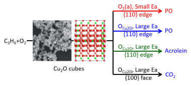 环氧丙烷(PO)是一种高价值化工中间体。丙烯与O2环氧化反应是最经济和绿色的PO生产途径,但由于缺乏高效催化剂,该反应也是最具挑战性的催化反应之一。铜基催化剂被广泛研究作为丙烯空气环氧化反应催化剂,但报道的PO选择性并不令人满意。在前期研究中,中国科学技术大学黄伟新教授团队发现Cu2O{110}晶面是催化丙烯空气环氧化反应的活性晶面(Angew. Chem. Int. Ed.2014, 53, 4856),并观察到小尺寸Cu2O立方体纳米晶具有高密度Cu2O{110}边位,在CO氧化反应中起主要催化作用(Angew. Chem. Int. Ed.2019, 58, 4276)。基于上述基础理解,黄伟新教授团队在本工作中设计了平均尺寸为27 nm的Cu2O立方体纳米晶用于丙烯空气环氧化反应,获得了80%以上的PO选择性,并证实了其Cu2O{110}边位为生成PO的活性位点。与此同时,发现了温度依赖的催化反应机理,在低反应温度下,主要发生Cu2O{110}边位催化的弱吸附O2物种为活性氧物种的低能垒Langmuir-Hinshelwood (LH)反应选择性生成PO,但弱吸附O2物种在高反应温度不稳定,则同时发生Cu2O{110}边位和Cu2O{100}面位催化的表面晶格氧为活性氧物种的高能垒Mars-van Krevelen (MvK)反应分别生成PO、丙烯醛和CO2。该研究结果为丙烯空气环氧化高效催化剂的研制提供了新思路。