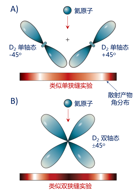 图1. 振动激发态的D2分子与He原子的非弹性碰撞:A) 单轴(uniaxial)态的D2分子的激光制备及其与He原子的碰撞;B) 双轴(biaxial)态的D2分子的激光制备及其与He原子的碰撞。两者表现出明显不同的产物角分布,体现了分子碰撞过程中的量子干涉对碰撞动力学的显著影响。(来源:V. ALTOUNIAN /SCIENCE)