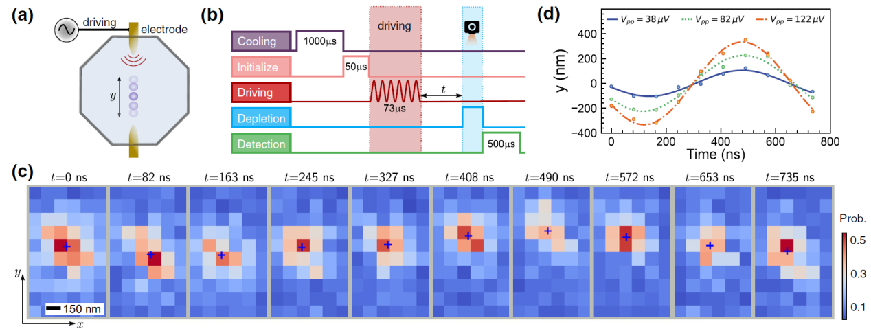 图2超分辨成像方法应用于离子动力学测量。(a)采用电信号激励离子y方向简谐运动,(b)成像时许,(c)对运动离子不同时刻的成像,拟合像斑中心(蓝色十字)可以清晰观测y方向的简谐振动。(d)不同激励电压的离子运动轨迹。