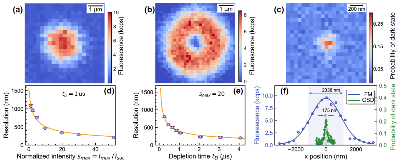 图1单离子超分辨成像。(a)单离子荧光成像,(b)利用离子作为探针测量的耗尽光模式,(c)单离子超分辨成像结果,(d-e)成像分辨率与耗尽光强和耗尽时间的关系,(f)单离子荧光成像(FM)与超分辨成像(GSD)分辨率对比。
