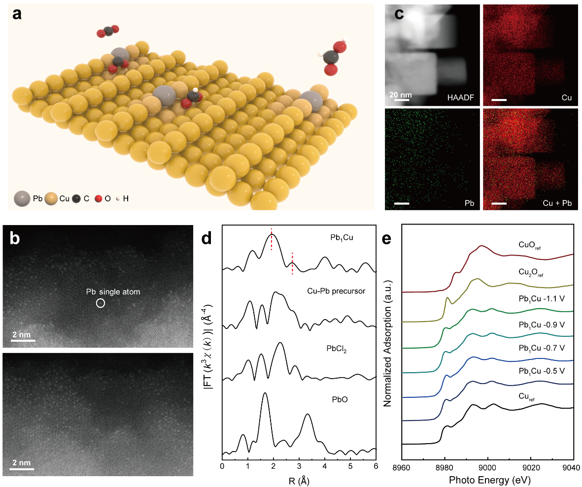图1.铅单原子修饰的铜催化剂的示意图和结构表征